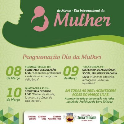 A programação tem início hoje (08/03), com a live “Ser mulher, profissional e mãe de uma criança com deficiência”, promovida pela Secretaria de Educação, às 18h; na terça-feira (09/03), haverá a live “Mulher na liderança, alcançando um futuro igualitário”, promovida pela Secretaria de Assistência Social, Mulher e Cidadania, às 19h; e na quarta-feira (10/03), haverá a live “Mulher de atitude luta contra o câncer de colo uterino”, promovida pela Secretaria de Saúde, às 19h. Além disso, serão divulgados vídeos com mulheres de diversas representatividades, como empreendedoras, professoras, domésticas, agricultoras e médicas.