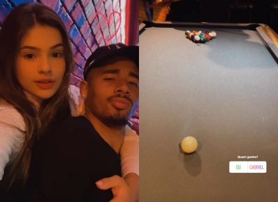 Gabriel Jesus e sua namorada, Raiane Lima, curtiram a noite coladinhos nesta segunda-feira (16). A influencer postou uma selfie abraçada no amado, além do registro de uma mesa de sinuca, com uma enquete perguntando quem seus seguidores acharam que venceria o jogo.