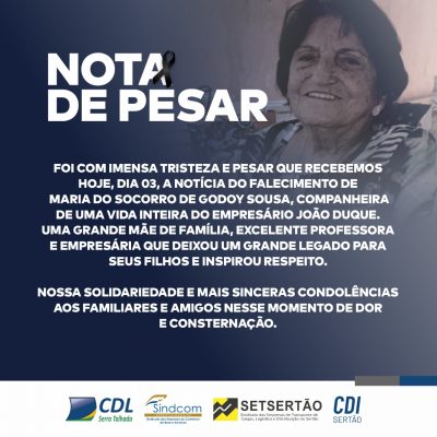 Foi com imensa tristeza e pesar que recebemos hoje, dia 03, a notícia do falecimento de Maria do Socorro de Godoy Sousa, companheira de uma vida inteira do empresário João Duque.