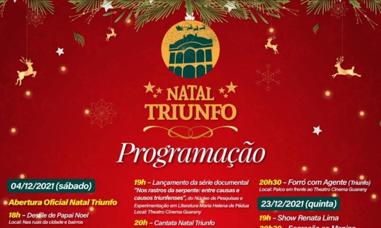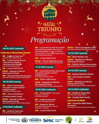 A Prefeitura de Triunfo, por meio da Secretaria Municipal de Turismo, Desenvolvimento e Lazer e junto ao Sesc Triunfo divulgou nessa segunda-feira (29) a programação do Natal Triunfo, um dos eventos tradicionais no calendário festivo da cidade.