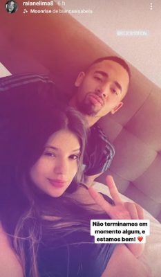 Fim dos rumores! Sem explicar o motivo de ter apagado as fotos com a namorada do Instagram, o atacante Gabriel Jesus publicou uma foto no story ao lado da pernambucana Raiane Lima. A publicação foi imediatamente respostada por ela, que também apagou as fotos com Jesus, no perfil na mesma rede social. Eles estão morando juntos na cidade de Manchester, na Inglaterra.