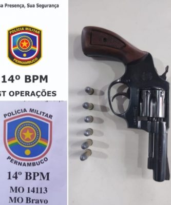 Policiais Militares do 14º BPM, durante blitz/bloqueio, efetuaram abordagem a um veículo com dois ocupantes no bairro Mutirão em Serra Talhada. Na bolsa da envolvida 02 foi encontrado um revólver calibre 32, oxidado, com 06 (seis) munições intactas.