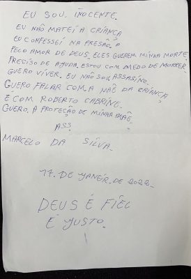 Segundo a Secretaria de Defesa Social (SDS), Marcelo da Silva confessou o crime para dois delegados da força-tarefa responsável pela investigação do caso, logo depois de o DNA contido na faca utilizada no assassinato da criança de 7 anos apontar que ele seria o assassino.