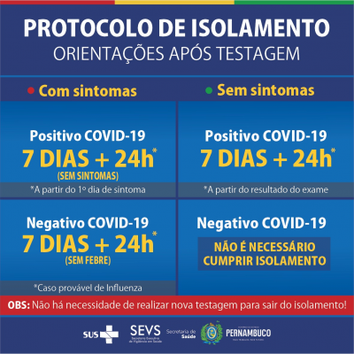 Após reunião do Comitê Técnico Estadual para Acompanhamento da Vacinação na manhã desta segunda-feira (31), a Secretaria de Estado da Saúde de Pernambuco (SES-PE) anunciou a atualização do protocolo estadual para o afastamento das funções e isolamento para casos positivos de Covid-19. Agora, o isolamento passa a ser de sete dias, para casos assintomáticos e sintomáticos.