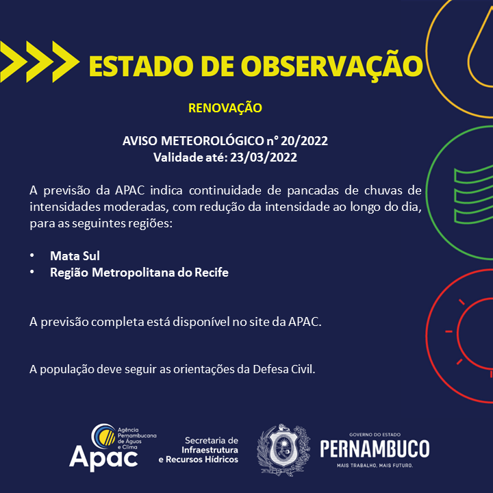 Segundo o aviso Meteorológico, a previsão da APAC indica continuidade de pancadas de chuvas de intensidades moderadas, com redução da intensidade ao longo do dia para a Mata Sul e Região Metropolitana do Recife.
