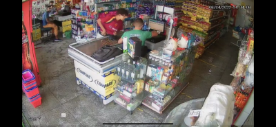 É possível ver nas imagens quando o assaltante se aproxima com a arma próximo aí balcão do estabelecimento e intimida o caixa.
