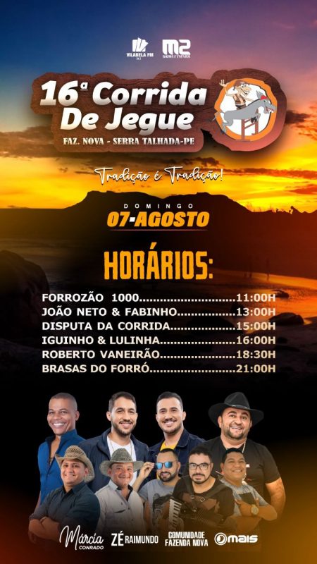 A 16ª Corrida de Jegue da Fazenda Nova, festa já tradicional na região, acontece hoje (7) com muitas atrações. Com slogan “Tradição é Tradição” os cantores Brasas do Forró, Iguinho e Lulinha, Roberto Vaneirão, João Neto e Fabinho e Forrozão 1000.