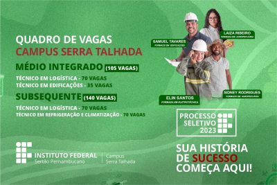 O campus Serra Talhada do IFSertãoPE está com inscrições abertas, até 24/10, para o Processo Seletivo 2023, referente aos cursos técnicos da Instituição. Este ano, alunos precisarão se cadastrar na plataforma Gov.BR, e utilizar o mesmo login e senha no Portal do Aluno do IFSertãoPE. Para se inscrever, o candidato precisa preencher todos os itens do Formulário de Inscrição, inclusive o Questionário Socioeconômico. A seleção será feita através de análise de histórico escolar. Por isso, no momento da inscrição, o candidato deve anexar frente e verso do documento emitido pela escola (ficha 18, para estudantes do Nível Fundamental; ficha 19, para Nível Médio) e inserir as notas, exigidas no respectivo edital, no sistema. Veja a seguir os cursos ofertados pelo Campus Serra Talhada.