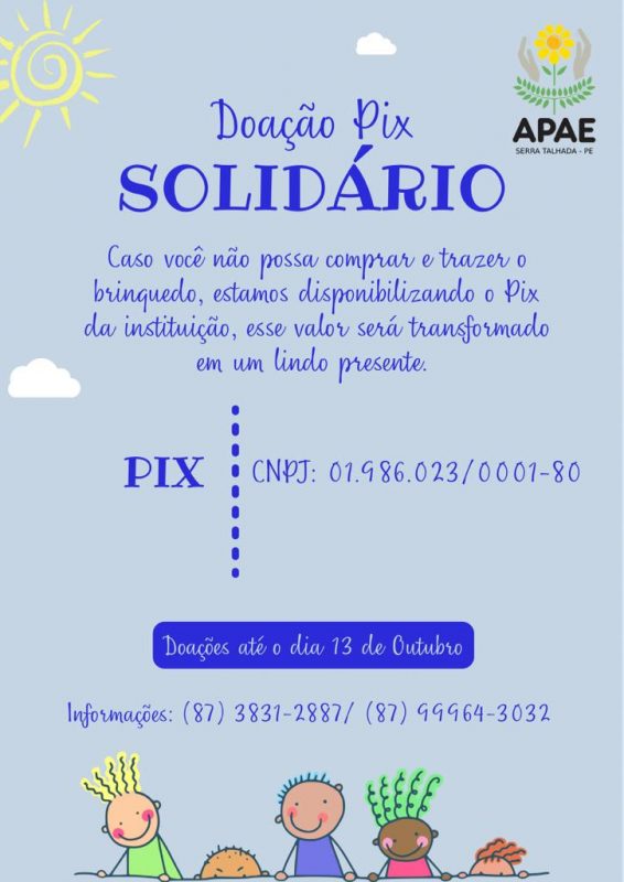 A APAE Serra Talhada está realizando a campanha “Pix Solidário” para arrecadar brinquedos ao dia das crianças. As doações podem ser feitas através do pix CNPJ 01.986.023/0001-80. Os valores doados serão convertidos em lindos presentes às crianças.