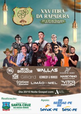 O prefeito Irlando Parabólicas divulgou nesta quinta-feira (6), a programação oficial da XXV Feira da Rapadura que acontece de 21 a 23 de outubro, no município de Santa Cruz da Baixa Verde, Sertão pernambucano. A programação contará com palestras, seminários e rodada de negócios, além de dos shows no Pátio de Eventos da cidade. Este ano o evento contará com a confecção da Maior Rapadura do Mundo, com 8 toneladas, que será auditada pelo Ranking Brasil, Livro dos Recordes. O responsável pela confecção é o proprietário do Engenho Bueno Aires, Valdemir Adriano, o mesmo fala do processo e da estrutura montada para confeccionar o doce “A idéia da primeira rapadura de duas toneladas surgiu em 1999, para homenagear a chegada do ano 2000, depois veio a de cinco toneladas. Toda estrutura era montada em cima de um reboque de trator reforçado, três eixos, desta vez será montada uma estrutura na carroceria de um caminhão, com formas montáveis. A produção da Maior Rapadura do Mundo levará dez dias e cento e trinta toneladas de cana-de-açúcar”, disse.
