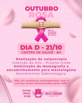 E neste sábado (21) será o dia D da campanha Outubro Rosa, com a realização de colposcopia, inserção de DIU, Projeto Linda, atendimento odontológico, solicitação de mamografia e encaminhamento das pacientes para profissionais mastologistas.
