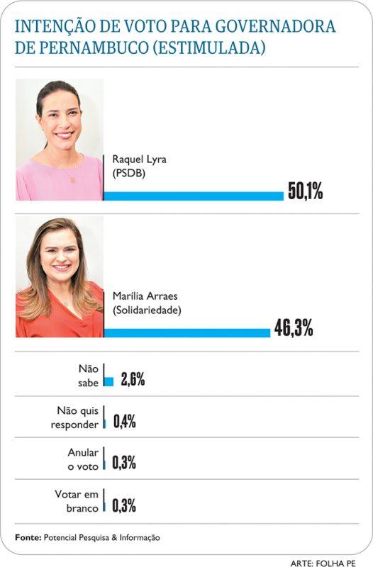 Pesquisa Potencial/Folha de Pernambuco divulgada nesta terça (25), para governo de Pernambuco mostra a candidata Raquel Lyra (PSDB) com 50,1% e Marília Arraes (Solidariedade) com 46,3% da intenção de votos estimulada. A margem de erro chega a 3,1 pontos percentuais para mais ou para menos.