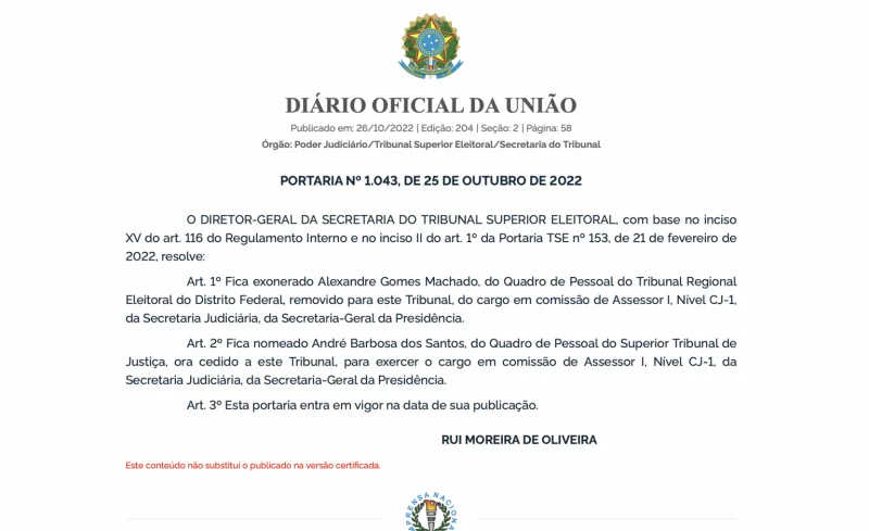 Em meio à denúncia da campanha de Jair Bolsonaro sobre ter sido prejudicado em inserções nas rádios, o Tribunal Superior Eleitoral decidiu exonerar o servidor Alexandre Gomes Machado, assessor de gabinete da Secretaria Judiciária da Secretaria-Geral da Presidência.