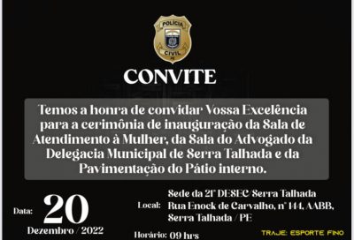 No dia 20 de Dezembro às 09h da manhã na sede da 21º DESEC Serra Talhada, acontecerá a cerimônia de inauguração da Sala de Atendimento á Mulher, da sala do Advogado da Delegacia Municipal de Serra Talhada e também da Pavimentação do pátio interno. O evento promete contar com grandes autoridades da cidade e fortificar essa causa em apoio as mulheres serratalhadenses e regionais.