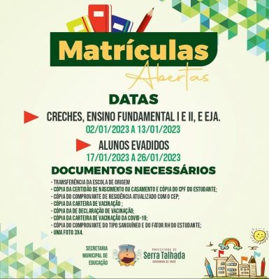 A Prefeitura Municipal de Serra Talhada, através da Secretaria de Educação iniciou na última semana a preparação do ano letivo de 2023 e convoca a toda população para se dirigirem até as creches ou escolas municipais e matricularem seus filhos.