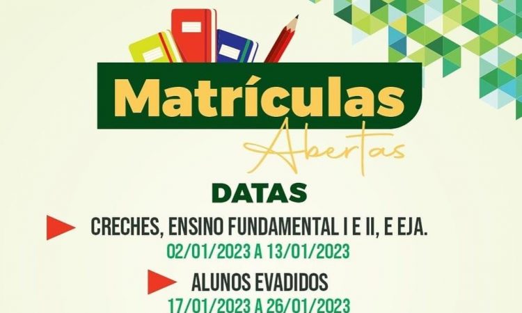 Detalhe: as matrículas para novos alunos das creches, ensino fundamental e EJA começaram no dia 02 e vão até 13 de janeiro e para alunos evadidos acontecem de 17 a 26 de janeiro.