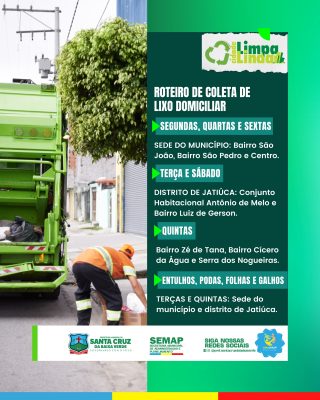 A Prefeitura Municipal de Santa Cruz da baixa Verde, através da Secretaria de Administração e Planejamento, reforça a divulgação do calendário de Coleta de Lixo Domiciliar que, também abrange o Distrito e Jatiúca.