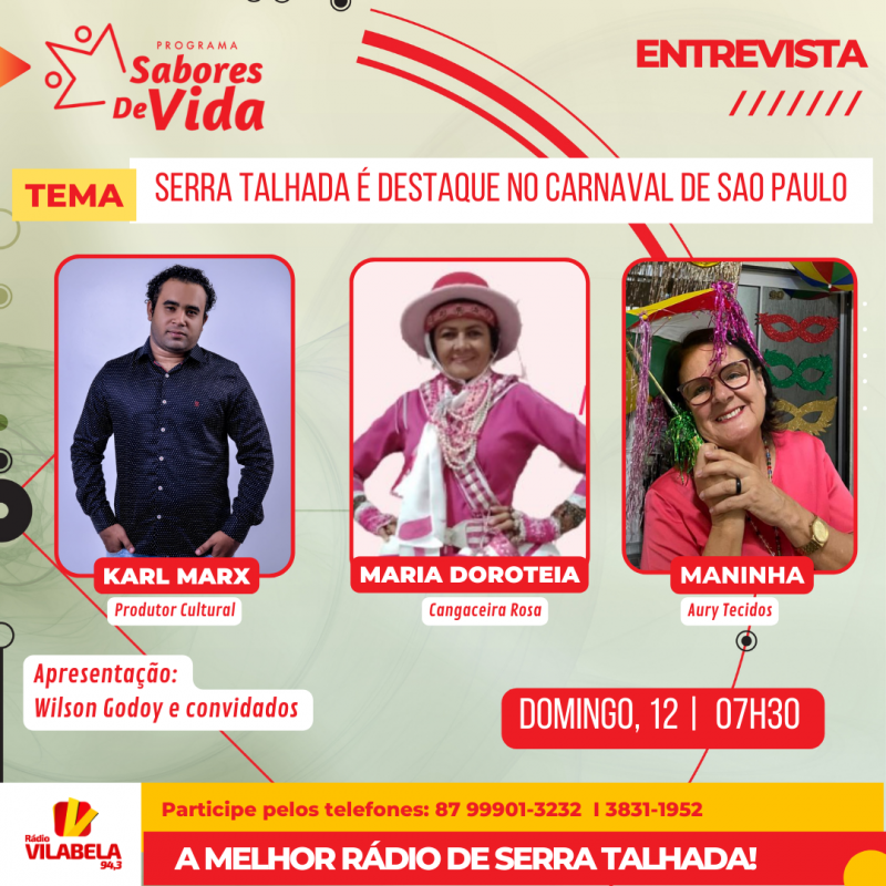 O programa Sabores de Vida deste domingo (12), na Rádio Vilabela, vai destacar a participação de serratalhadenses no desfile da escola de samba Mancha Verde de São Paulo que homenageará o sertão de Pernambuco, o cangaço e o xaxado no carnaval 2023. O samba-enredo da escola será “Oxente – Sou xaxado, sou Nordeste, sou Brasil”.