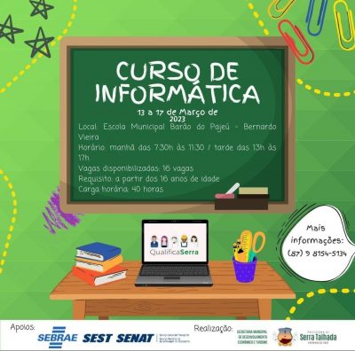 A Prefeitura de Serra Talhada divulgou nessa quarta-feira (01) através da Secretaria Municipal de Desenvolvimento Econômico e Turismo as inscrições abertas para o CURSO DE INFORMÁTICA que serão ofertado pelo Programa Qualifica Serra em parceria com o SEBRAE e SEST/SENAT, totalmente GRATUITO.