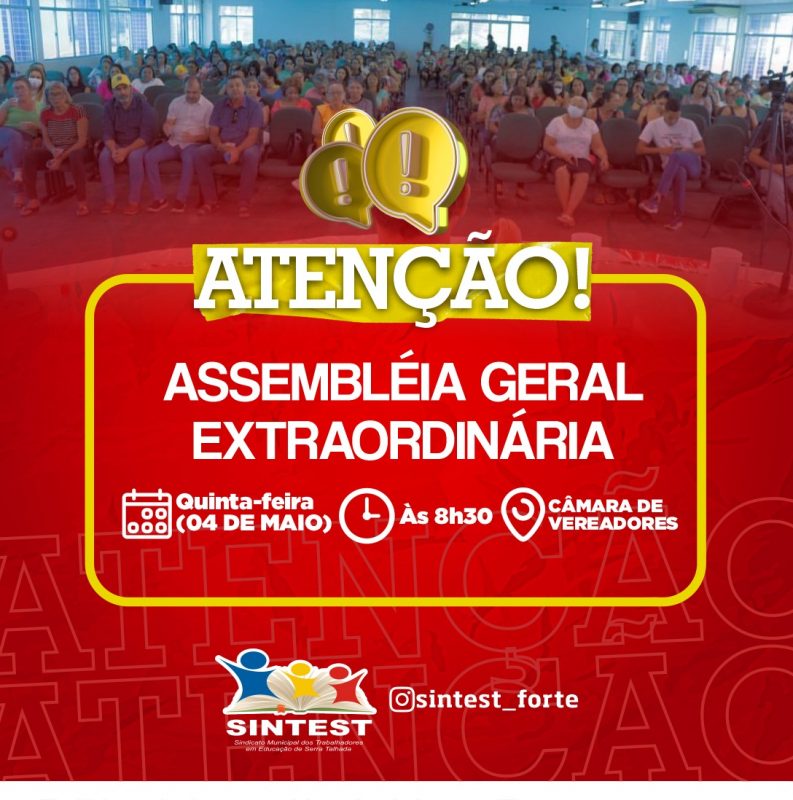 O Sindicato dos Trabalhadores em Educação de Serra Talhada (SINTEST), realizará uma assembleia extraordinária com a categoria na manhã desta quinta-feira (04), a partir das 8h30, na Câmara de Vereadores de Serra Talhada.