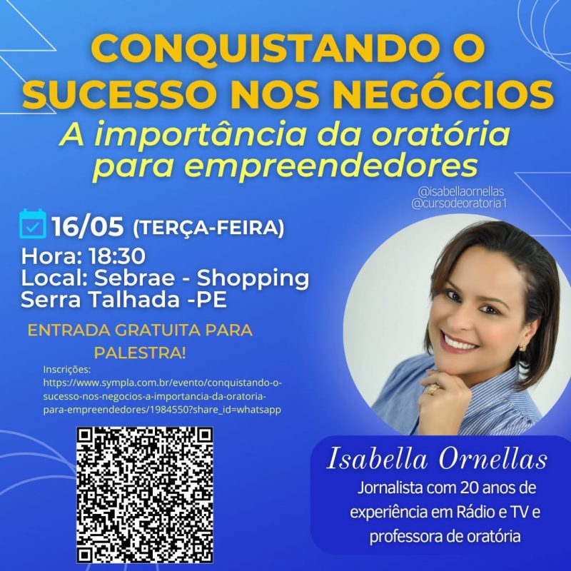 No mundo dos negócios, a habilidade de se comunicar de forma clara, persuasiva e cativante é fundamental para o sucesso. E é nesse contexto que a renomada jornalista Isabella Ornellas traz uma palestra imperdível sobre a importância da oratória para empreendedores. Será nesta terça-feira (16), às 19h no Sebrae Serra Talhada. As incrições podem ser feitas neste link.