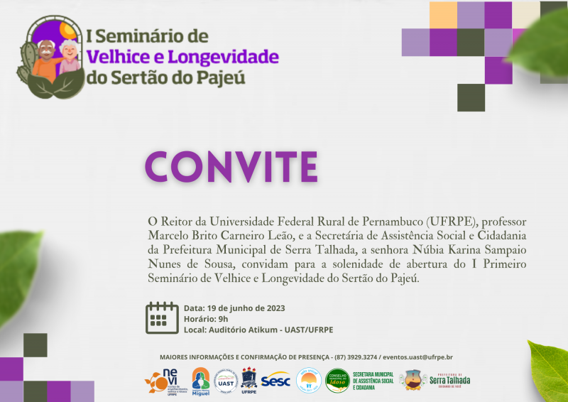 No dia 19 de junho de 2023, a Universidade Federal Rural de Pernambuco (UFRPE) e a Secretaria de Assistência Social e Cidadania da Prefeitura Municipal de Serra Talhada realizarão a abertura do I Seminário de Velhice e Longevidade do Sertão do Pajeú. O evento acontecerá no Auditório Atikum, localizado na UAST/UFRPE, a partir das 9h.
