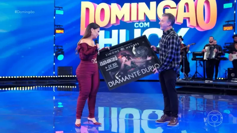 No último domingo, 18 de junho, o programa Domingão com Huck foi palco de momentos emocionantes para a cantora Simone Mendes. A convidada especial do programa não conteve as lágrimas ao receber uma sequência de surpresas durante sua participação. Além de ganhar um disco de diamante duplo pelo sucesso estrondoso de sua música “Erro Gostoso”, a artista foi homenageada por Ivete Sangalo e por seu marido, o empresário Kaká Diniz.