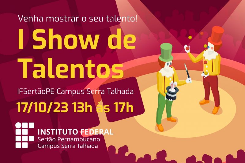 O campus Serra Talhada irá promover, no dia 17 de outubro de 2023, o seu “I Show de Talentos”. As inscrições são gratuitas e poderão ser realizadas até o dia 13 de outubro, na sala de Assistência ao Educando. Qualquer aluno(a) do campus poderá se inscrever e demonstrar o seu talento na música, na dança, nas artes cênicas ou circenses, entre outras formas de expressão artística e cultural.