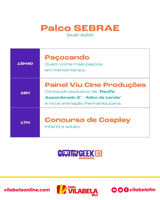 Entre as atividades que animaram os participantes, destacaram-se a Arenga Nerd, o Sound Geek, o Karaokê e os especiais dedicados a Naruto e Harry Potter. O desfile cosplay Pet encantou os amantes dos animais, enquanto Kelvin Diz trouxe o lado geek para o universo do forró. O encerramento ficou por conta do dublador Jorge Lucas.