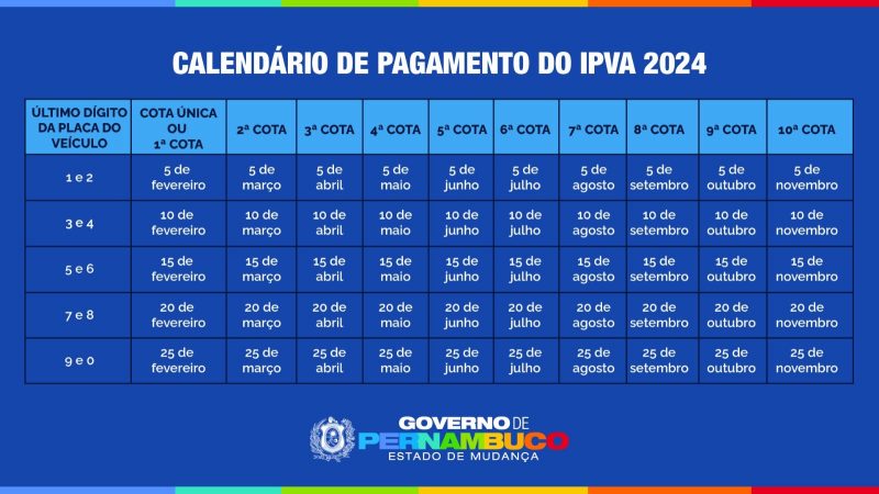 Outro decreto sobre o IPVA, publicado no último sábado (23), oficializou o calendário de arrecadação, iniciando os pagamentos – conforme a placa – em cinco de fevereiro, com a última parcela, para os que optarem pela divisão nos dez meses, em novembro. Os contribuintes que optarem pelo pagamento em cota única, no mês de fevereiro, terão um desconto de 7%.
