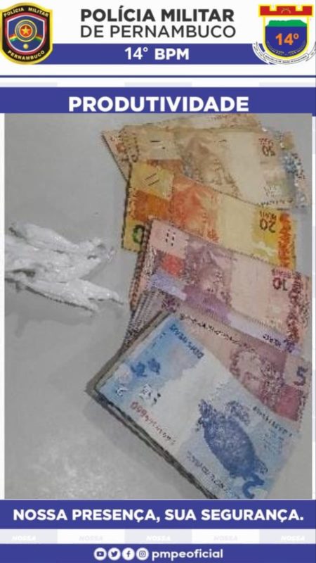Na madrugada desta quarta-feira, policiais militares do 14º BPM, em patrulhamento ostensivo na COHAB, em Serra Talhada, avistaram indivíduos dentro de um veículo S10 Blazer prata. Ao notarem a presença policial, os suspeitos empreenderam fuga. Após perseguição e abordagem, foi encontrada no banco do motorista, com o primeiro indivíduo abordado, uma quantidade significativa de substância semelhante à cocaína, embalada em 8 invólucros plásticos, totalizando cerca de 6 gramas, além de R$523,00 em diversas cédulas e um celular Samsung A10 azul.
