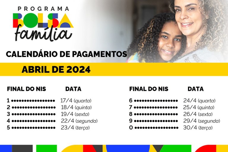 O calendário de pagamentos do Bolsa Família em abril de 2024 tem início nesta quarta-feira (17/4). Neste mês, mais de 20,8 milhões de famílias vão receber os repasses do programa de transferência de renda do Governo Federal. O valor médio do benefício por família é de R$ 680,90. O investimento necessário totaliza R$ 14,1 bilhões. O cronograma obedece o final do Número de Identificação Social (NIS) de cada um dos beneficiários (veja abaixo) e segue até o dia 30.