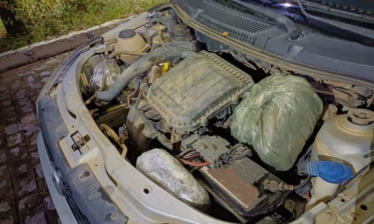 Ao abrir o capô do carro para verificar o motor, a equipe localizou três sacos contendo a substância análoga à maconha. Após consulta, foi constatado que o veículo não possuía irregularidades.