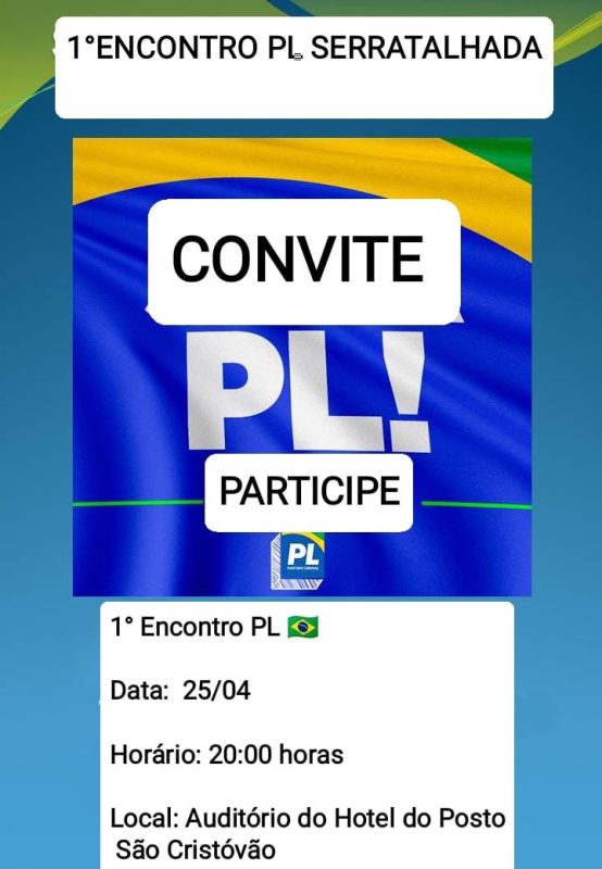 O Partido Liberal (PL) realiza o seu primeiro encontro no município de Serra Talhada, no Auditório do Hotel do Posto São Cristóvão, nesta quinta (25), às 20:00 horas. O evento marca o lançamento do pré-candidato a prefeito, PM Jucelio, além de apresentar os pré-candidatos a vereadores para as próximas eleições municipais.