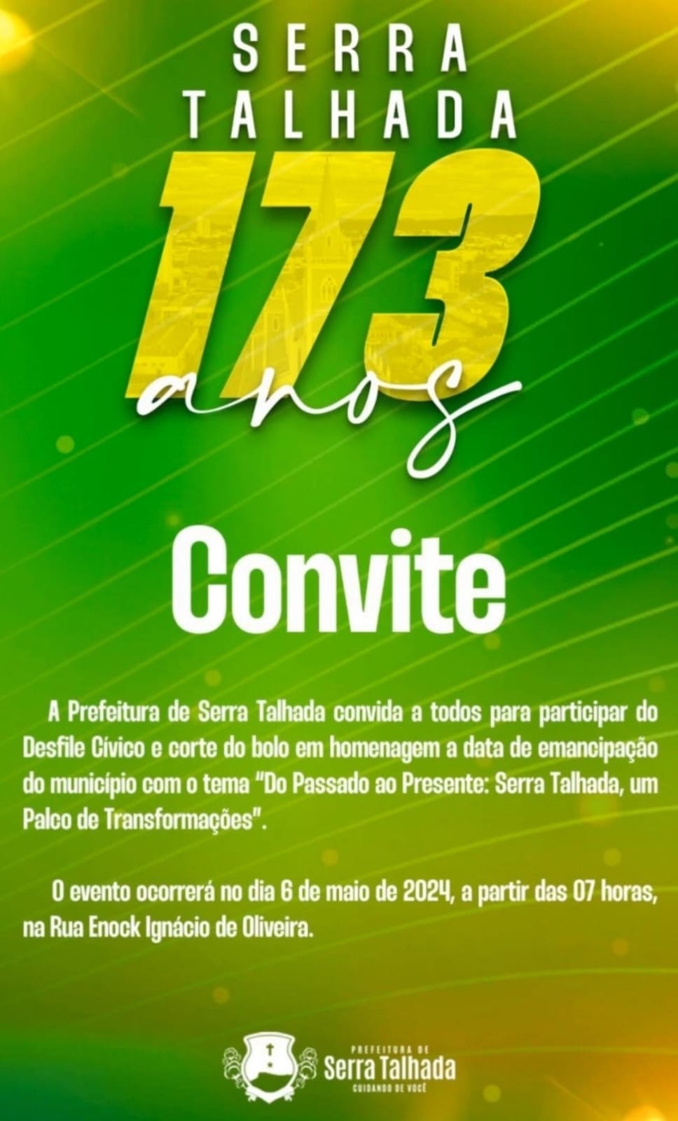 A Prefeitura de Serra Talhada divulgou o convite para o Desfile Cívico e tradicional corte do bolo, em celebração aos 173 anos emancipação do município.