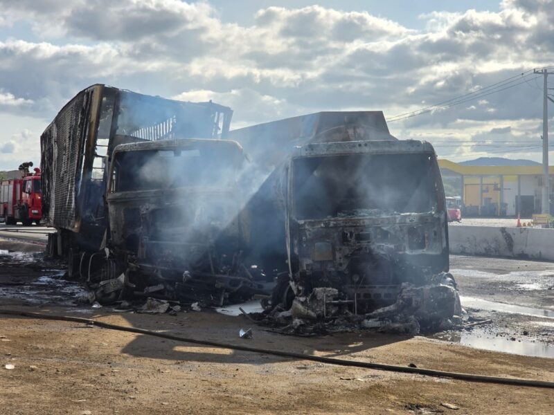 Por volta das 14h20, a Polícia Rodoviária Federal (PRF) foi acionada para atender a um acidente no km 103 da BR 232, em Bezerros, no sentido Recife. A ocorrência envolveu uma colisão lateral entre um caminhão tanque e um caminhão baú. Após o impacto, ambos os veículos pegaram fogo.