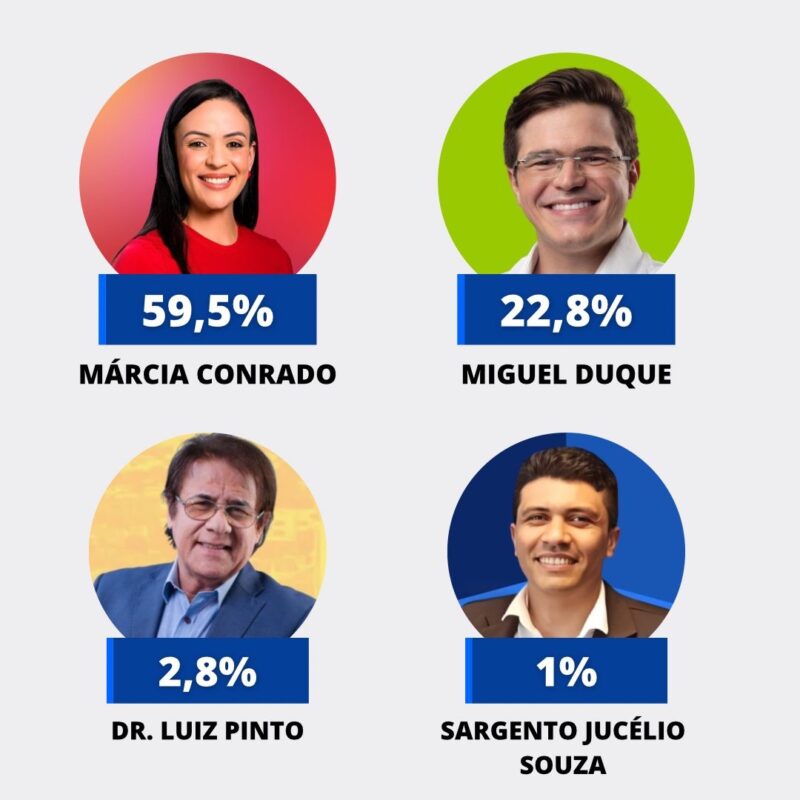 Doutor Luiz Pinto (Psol) pontuou 2,8% e o Sargento Jucelio Souza (PL) 1%. Brancos e nulos somam 4% e os que disseram que se apresentam indecisos chegam a 9,9%. Na espontânea, modelo pelo qual o entrevistado é forçado a lembrar o nome do seu candidato preferencial, Márcia abre 30 pontos de vantagem. Se as eleições fossem hoje, ela teria 46% dos votos e Miguel Duque 16,8%. Sargento Jucelio foi citado por apenas 0,3%. Neste cenário, brancos e nulos somam 2,5% e indecisos sobem para 32,9%.