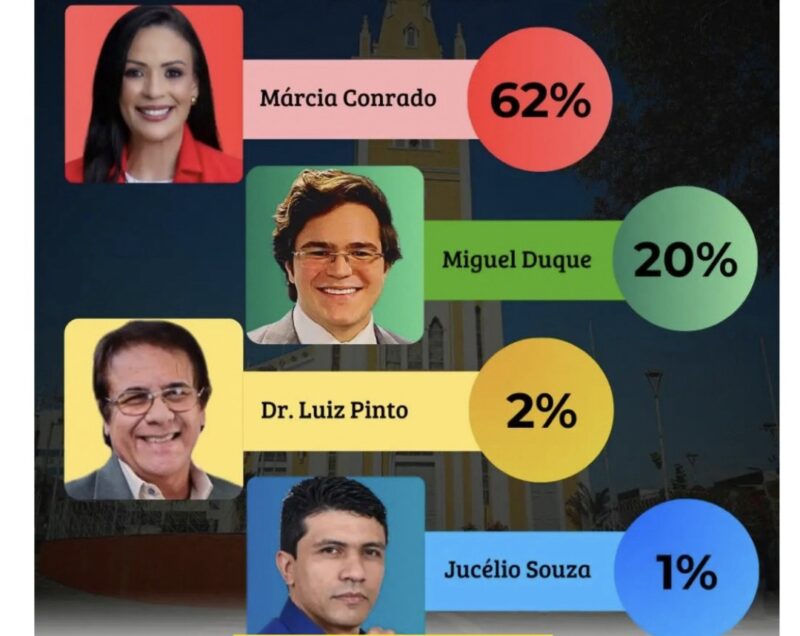 A primeira pesquisa do Instituto Múltipla sobre a corrida sucessória de Serra Talhada revela que a atual prefeita e candidata à reeleição, Márcia Conrado (PT), está na liderança com 62% das intenções de voto na pesquisa estimulada. O principal opositor, Miguel Duque (Podemos), aparece com 20%. O médico Luiz Pinto (PSOL) tem 2%, enquanto o Sargento Jucélio (PL) registra 1%. Brancos e nulos somam 5%, e 10% dos entrevistados não souberam ou não responderam.