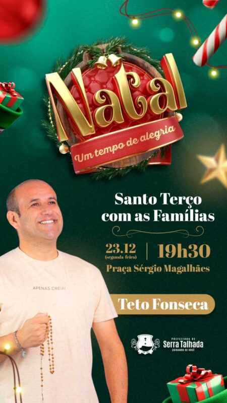 Serra Talhada, PE – Nesta segunda-feira (23), dentro da programação de Natal da cidade, será realizado o Santo Terço com as Famílias, às 19h30, na Praça Sérgio Magalhães.