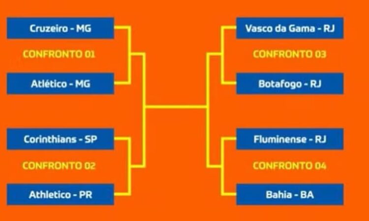 Quem passar do confronto entre os clubes mineiros enfrenta Corinthians ou Athletico-PR nas semifinais. Do outro lado, o vencedor do clássico carioca vai medir forças com Fluminense ou Bahia.
