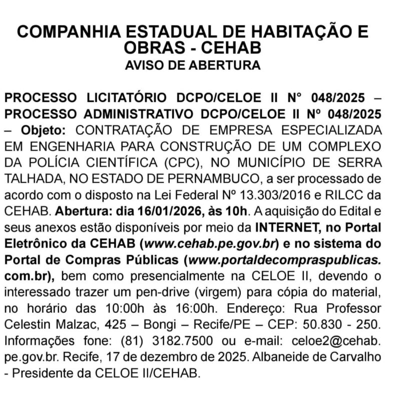 O deputado estadual Luciano Duque comemorou a abertura do processo licitatório para a construção do Complexo da Polícia Científica em Serra Talhada, um passo decisivo para a implantação do Instituto de Medicina Legal (IML) no Sertão do Pajeú. A iniciativa representa um avanço histórico para a região, garantindo mais estrutura, agilidade e dignidade na realização dos serviços periciais, além de reforçar a política de interiorização da segurança pública em Pernambuco.