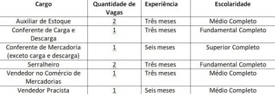 As vagas possuem a exigência de experiência de três a seis meses, nas áreas de Auxiliar de estoque, Conferente de Carga e Descarga, Conferente de Mercadoria (exceto carga e descarga); serralheiro; vendedor no Comércio de Mercadorias; vendedor pracista. Os salários não foram informados.