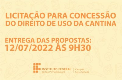 O campus Serra Talhada do IFSertãoPE publicou o edital do Pregão Presencial n° 16/2022, cujo objeto trata da concessão onerosa de direito de uso de espaço físico para instalação e funcionamento da cantina da unidade de ensino.